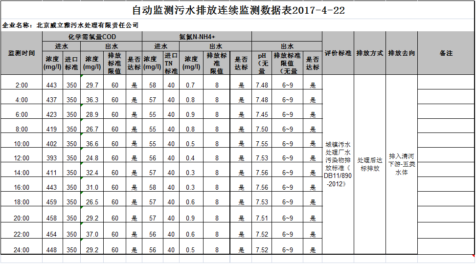 自动监测污水排放连续监测数据表2017-4-22